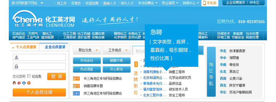 急聘區(qū)位于首屏導(dǎo)航下方位置顯著,極大吸引求職者注意力及對(duì)招聘位置的關(guān)注度,有效解決企業(yè)緊急招聘問(wèn)題。