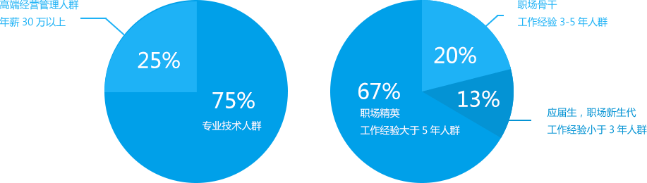 英才網(wǎng)聯(lián)的專業(yè)人才庫中專業(yè)技術(shù)人群占比頗高,可見專業(yè)技術(shù)人群非常雄厚、充足。同時,對于企業(yè)客戶來講,應(yīng)屆生、職場新生代、職場骨干、職場精英等人群可謂應(yīng)有盡有,足夠滿足企業(yè)的日常招聘、專業(yè)崗位的招聘等需求。